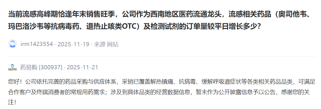 当前流感高峰期恰逢年末销售旺季,公司作为西南地区医药流通龙头,流感相关药品(奥司他韦、玛巴洛沙韦等抗病毒药、退热止咳类OTC)及检测试剂的订单量较平日增长多少?