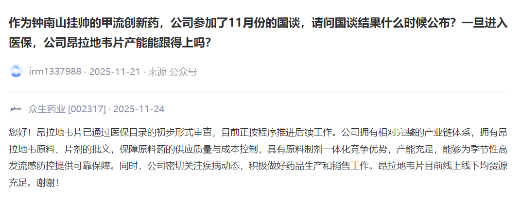 众生药业[002317] :昂拉地韦片已通过医保目录的初步形式审查,目前正按程序推进后续工作。公司拥有相对完整的产业链体系,拥有昂拉地韦原料、片剂的批文,保障原料药的供应质量与成本控制,具有原料制剂一体化竞争优势,产能充足,能够为季节性高发流感防控提供可靠保障。同时,公司密切关注疾病动态,积极做好药品生产和销售工作。昂拉地韦片目前线上线下均货源充足。