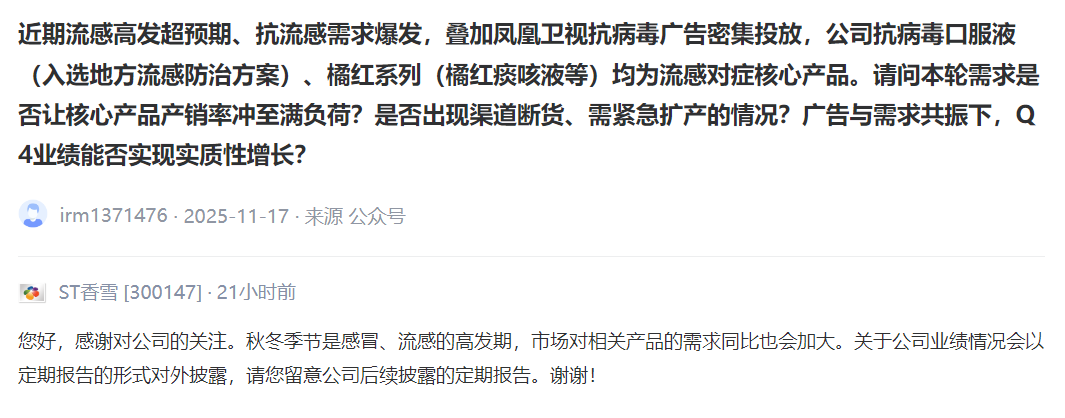 近期流感高发超预期、抗流感需求爆发,叠加凤凰卫视抗病毒广告密集投放,公司抗病毒口服液(入选地方流感防治方案)、橘红系列(橘红痰咳液等)均为流感对症核心产品。请问本轮需求是否让核心产品产销率冲至满负荷?是否出现渠道断货、需紧急扩产的情况?广告与需求共振下,Q4业绩能否实现实质性增长?