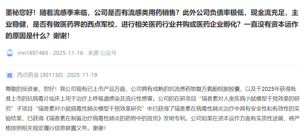 西点药业 [301130] :我公司现有已上市产品方面,公司拥有成熟的抗流感药物复方氨酚烷胺胶囊,以及于2025年获得批准上市的抗病毒片临床上用于治疗上呼吸道感染及流行性感冒。公司的在研项目“瑞香素对人类疾病小鼠模型干预效果的研究”子项目“瑞香素对小鼠病毒性肺炎模型干预效果研究”中已获得了瑞香素在病毒性肺炎治疗中具有安全性和有效性的实验结果,已获得《瑞香素在制备治疗病毒性肺炎的药物中的应用》发明专利。公司如果在资本运作方面有实质性进展,将严格按照相关规定履行信息披露义务。