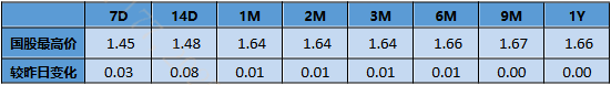 今日资金面市场整体均衡。早盘大行国股行部分融出。早盘市价利率存单隔夜1.48附近,信用隔夜1.53附近,利率7dofr在1.49、信用7dofr在1.50-1.51附近,信用14dofr在1.52-1.53附近。公开市场操作后,各期限价格波动不大,临近午盘,隔夜成交至押利率1.45%附近,押存单商金1.46%-1.47%区间,信用7dofr下至1.49-1.50,14dofr维持在1.52附近。午后各期限价格较午前未有明显变化,信用7dofr在1.49-1.5,14dofr在1.52附近,三点之后,隔夜价格稍有下行ofr在1.43-1.45附近,各机构陆续平盘。