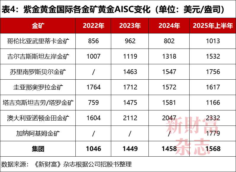 2025年上半年,其吉劳/塔罗金矿减少至1166美元/盎司,波动较大;多数金矿AISC都有所提升,所有金矿AISC整体增加至1568美元/盎司,增幅为7.5%。