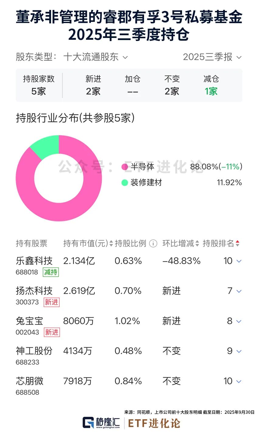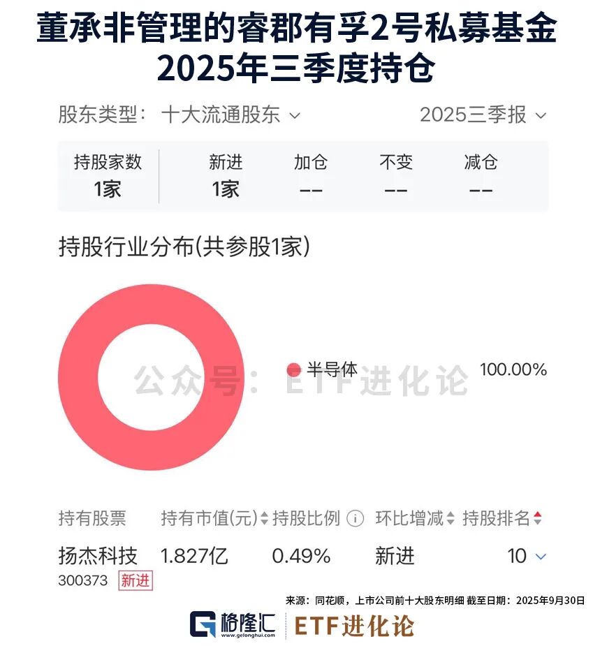 根据上市公司三季报数据,2025年三季度末董承非管理的有孚1号、有孚2号、有孚3号基金扬杰科技、芯朋微、兔宝宝、神工股份、鼎龙股份等上市公司前十大股东明细。