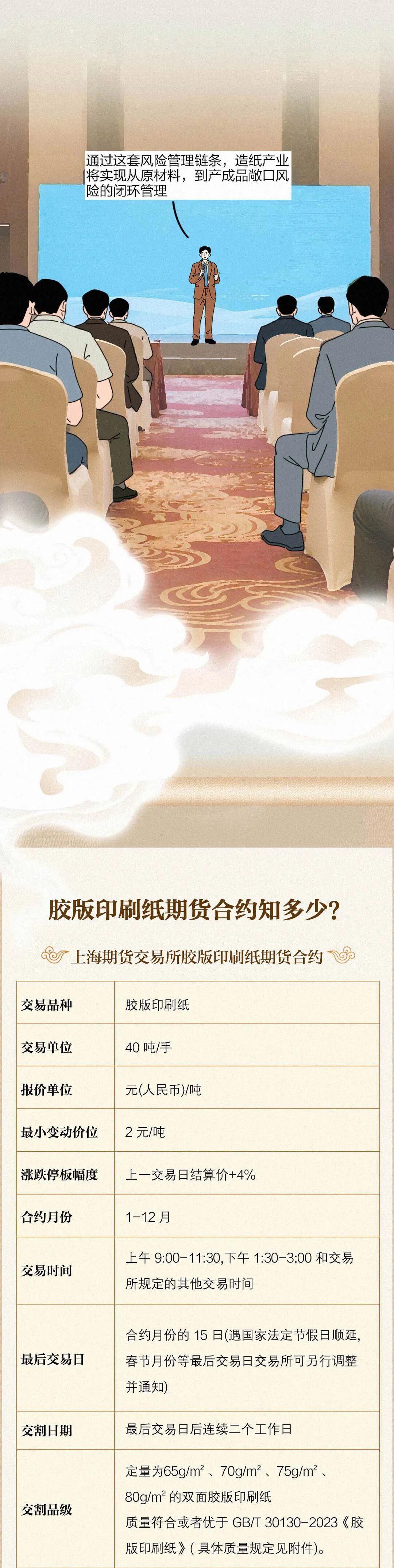 我国是全球最大的胶版印刷纸生产国和消费国。2024年我国胶版印刷纸产量948万吨,表观消费量871万吨。近年来,国内外市场环境复杂多变,我国造纸工业面临着较大营收增长压力,产业避险需求较高。推出胶版印刷纸期货和期权,将填补国内文化用纸金融衍生品的空白,为我国文化用纸产业链企业提供精准管理价格波动风险的工具,加快形成公开透明公允的市场价格。同时,与纸浆期货形成协同效应,打造“纸浆-胶版印刷纸”的完整风险管理链条,加强上下游企业对从原材料到产成品敞口风险的闭环管理,完善浆纸产业全周期风险管理体系,提升商品期货市场服务实体经济质效。