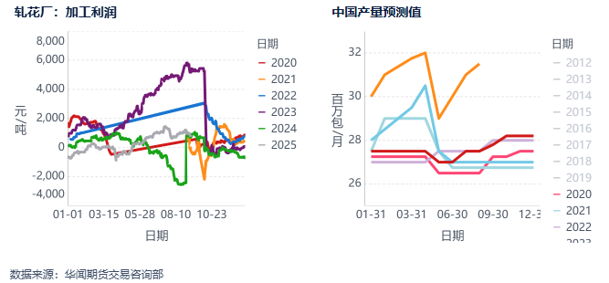 国际棉价继续盘整。当前年度国际棉花供需结构趋于平衡,因中国进口大幅下滑抵消了美棉产量下滑带来的利多影响。近期美棉产区天气不佳,根据美国国家农业统计局(NASS)8月作物产量报告,棉花种植面积环比下调8%,至930万英亩。由于美国西南部地区干旱,全国预计弃收率从14%升至21%,因此收割面积减少15%,降至740万英亩。产量预测下调至288万吨,较7月预测减少30万吨,较 2024/25年度减少26万吨。