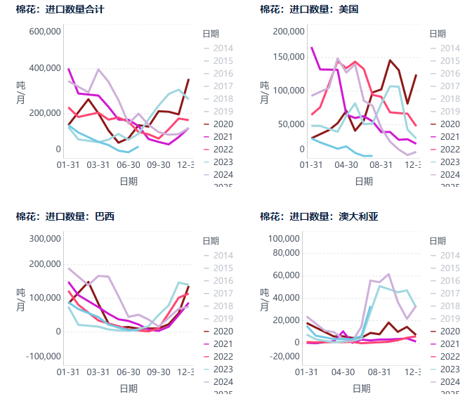 中国海关公布的数据显示,中国2025年7月棉花进口量为5.31万吨,同比减少14.63万吨,降幅73.37%;2025年1-7月累计进口棉花51.31万吨,同比减少74.2%;2024/25年度(2024.9-2025.7)我国棉花进口量总量近98.03万吨,同比减211万吨,降幅逾68%。