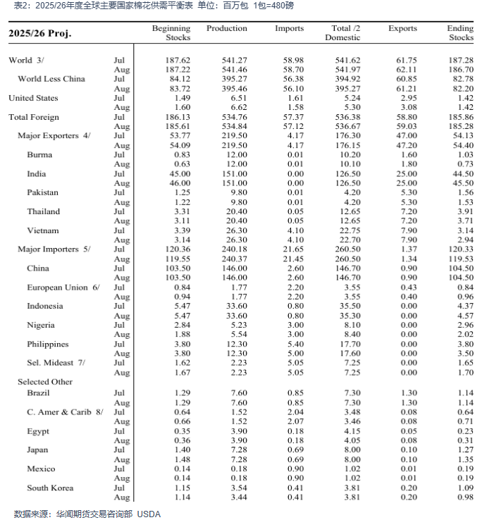 USDA8月报预估2025/26年度全球棉花供需结构有好转。供应端,美国、澳大利亚、中国产量预期下滑;需求端,因南亚、中东等地区需求存在刚需,预计全球棉花市场将继续恢复增长。