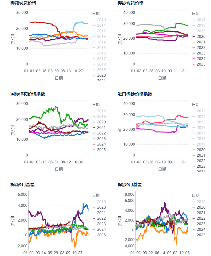 巴西国家商品供应公司调查显示,截止8月23日当周,巴西(98%)棉花总的收割进度为60.3%,环比增加11.4个百分点,较去年同期慢15.8%。收割进度同比降幅维持,主要 印度棉花协会(CAI)的报告显示,截至8月15日前后,印度棉花播种面积较去年同期减少约3%(今年播种面积约为1070万公顷)。尽管播种面积减少,但CAI预计棉花单产增幅可能达到10%,因此2025/26年度印度棉花总产量预计轻松达到3250-3300万包(每包170公斤,约552.5~561万吨)。