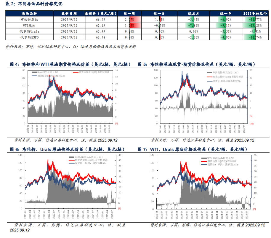 原油价格:截至2025年09月12日当周,布伦特原油期货结算价为66.99美元/桶,较上周上升1.49美元/桶(+2.27%);WTI原油期货结算价为62.69美元/桶,较上周上升0.82美元/桶(+1.33%);俄罗斯Urals原油现货价为65.49美元/桶,与上周持平;俄罗斯ESPO原油现货价为62.78美元/桶,与上周持平。
