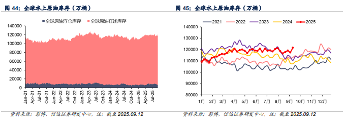 截至2025年9月12日当周,全球原油水上库存(包括在途和浮仓)为12.17亿桶,较上周+4203万桶(+3.45%)。其中,全球原油浮仓库存为6380.9万桶,较上周-797万桶(-12.49%);全球原油在途库存为11.53亿桶,较上周+5000万桶(+4.34%)。