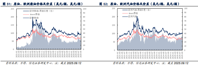 欧洲市场:截至2025年09月12日当周,欧洲柴油、汽油、航煤周均价分别为93.62(-0.19)、101.59(-0.17)、97.09(-0.72)美元/桶;与原油差价分别为27.15(+1.01)、35.12(+1.03)、30.62(+0.47)美元/桶。