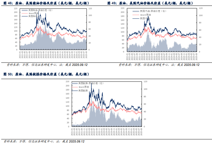 原油价差:截至2025年09月12日当周,布伦特-WTI期货价差为4.3美元/桶,较上周扩大0.67美元/桶;布伦特现货-期货价差为0.82美元/桶,较上周扩大0.92美元/桶;布伦特-俄罗斯Urals价差为1.5美元/桶,较上周扩大1.49美元/桶;WTI-俄罗斯Urals价差为-2.8美元/桶,较上周扩大0.82美元/桶。布伦特-俄罗斯ESPO价差为4.21美元/桶,较上周扩大2.4美元/桶;WTI-俄罗斯ESPO价差为-0.09美元/桶,较上周扩大1.73美元/桶。