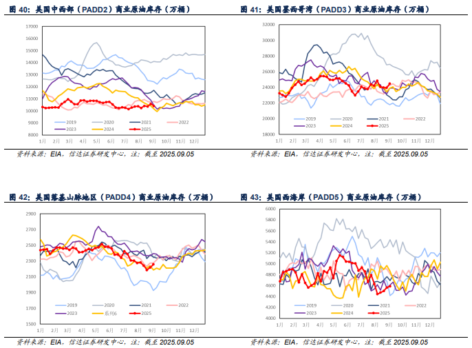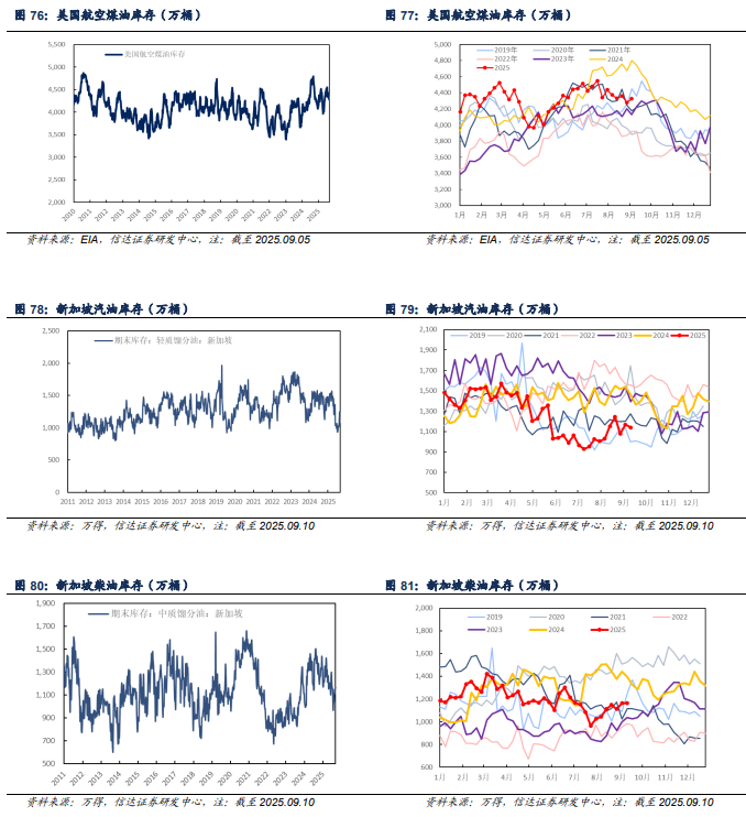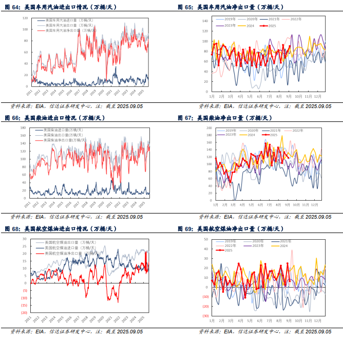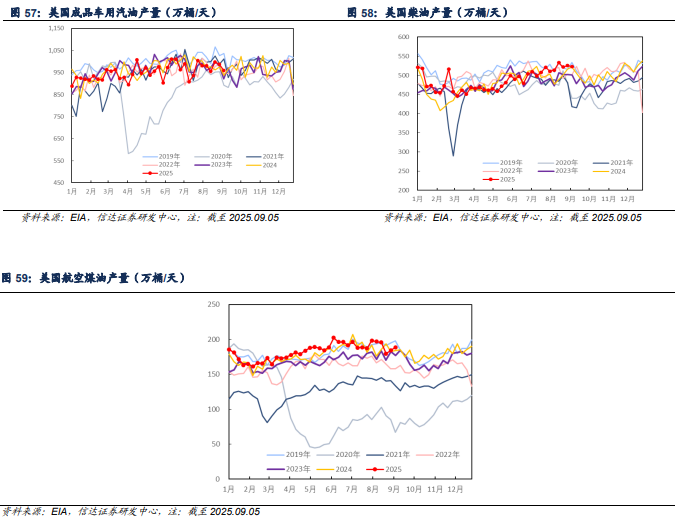 产量方面:截至2025年09月05日当周,美国成品车用汽油、柴油、航空煤油产量分别为958.7、522.9、188.7万桶/天,较上周分别-28.5(-2.89%)、-2.4(-0.46%)、+4.6(+2.50%)万桶/天。