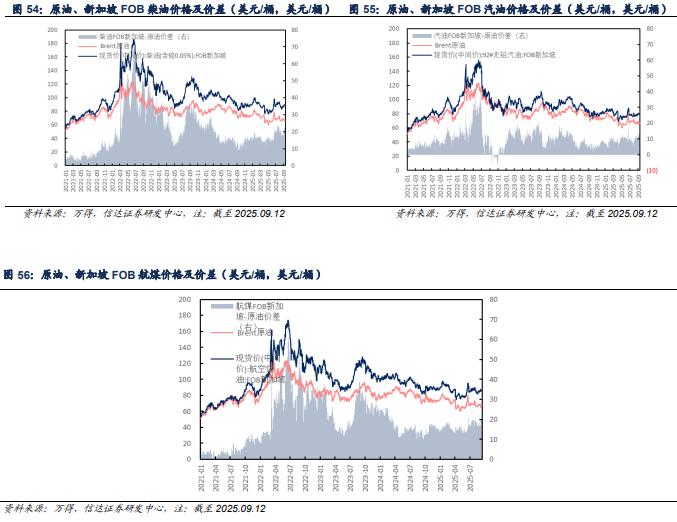 东南亚市场:截至2025年09月12日当周,新加坡柴油、汽油、航煤周均价分别为88.59(+0.91)、79.19(-0.54)、85.66(+0.25)美元/桶;与原油差价分别为22.29(+2.29)、12.88(+0.82)、19.40(+1.66)美元/桶。