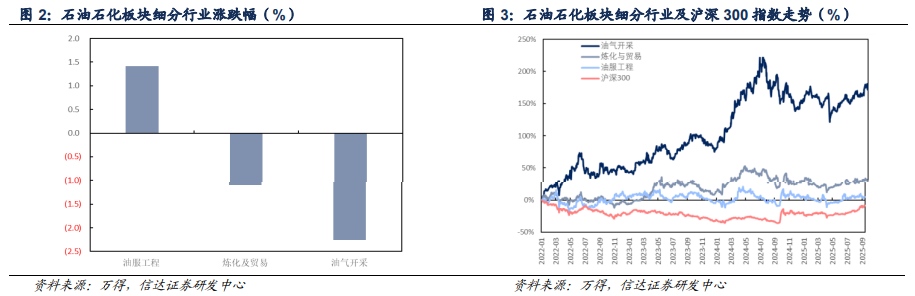 截至2025年9月12日当周,油服工程板块上涨1.41%,炼化及贸易板块下跌1.10%,油气开采板块下跌2.26%。