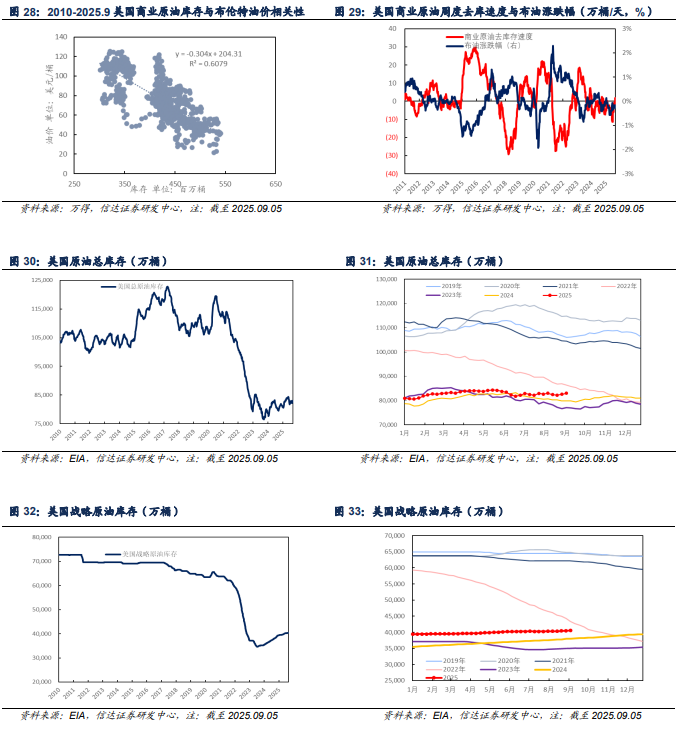 【美国原油供给】截至2025年09月05日当周,美国原油产量为1349.5万桶/天,较上周增加7.2万桶/天。截至2025年09月12日当周,美国活跃钻机数量为416台,较上周增加2台。截至2025年09月12日当周,美国压裂车队数量为169部,较上周增加5部。