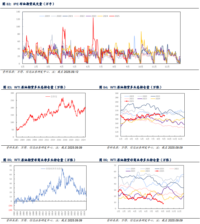原油期货成交及持仓:截至2025年09月12日,周内布伦特原油期货成交量为200.1万手,较上周增加18.49万手(+10.18%)。截止至2025年09月09日,周内WTI原油期货多头总持仓量为195.71万张,较上周减少3.07万张(-1.55%);非商业(投机和套利目的持有)净多头持仓8.18万张,较上周减少2.06万张(-20.10%)。