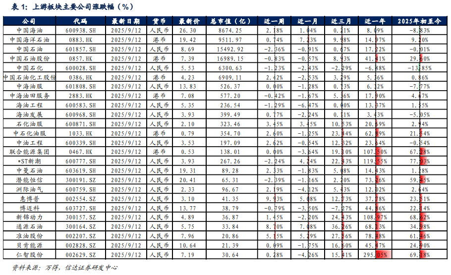 截至2025年9月12日当周,上游板块股价表现较好的惠博普(+9.93%)、通源石油(+8.70%)、准油股份(+5.15%)。