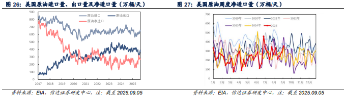 截至2025年09月05日当周,美国原油进口量为627.1万桶/天,较上周减少47.1万桶/天(-6.99%),美国原油出口量为274.5万桶/天,较上周减少113.9万桶/天(-29.33%),净进口量为352.6万桶/天,较上周增加66.8万桶/天(+23.37%)。