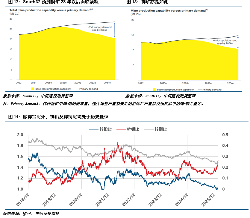 比价逻辑方面,1)铜铝比价,铜锌回归逻辑在矿。矿企考虑各类金属性价比后,或选择铜/贵金属比例更高的矿区优先开采。South32预测,铜及锌矿在2026-2028年间趋于紧平衡,但28年以后紧缺程度将大幅走扩。铝锌作为合金(例如热镀合金)的互补品,不存在明显的替代效应,合金中铝比例最低可调至0.05。