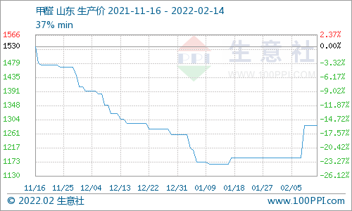 甲醛02月13日最新价格1286.67元/吨,最近5天上涨8.43%,30天上涨10.29%。