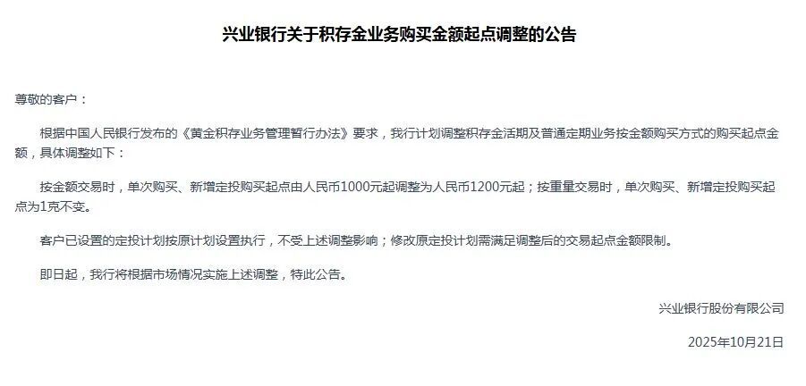 同日,兴业银行同样公告称,计划调整积存金活期及普通定期业务按金额购买方式的购买起点金额。即日起,按金额交易时,客户单次购买、新增定投购买起点由1000元起调整为1200元起;按重量交易时,单次购买、新增定投购买起点为1克不变。