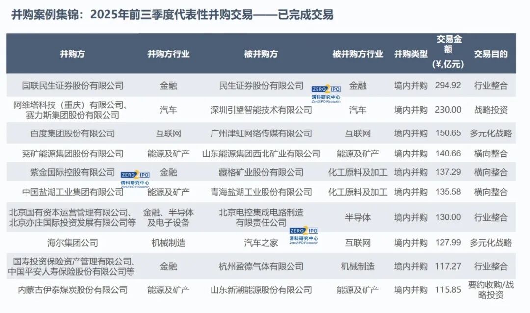 其中,机械制造(946.64亿元,280.1%;231起,+67.4%)行业2025年前三季度并购交易案例数量最高、规模第三,并购方以机械制造同业企业或VC/PE机构为主。半导体及电子设备(1003.61亿元,+178.5%;227起,+17.0%)行业2025年前三季度并购交易规模和数量均居第二位。IT(205.20亿元,-6.3%;202起,+6.9%)行业2025年前三季度并购交易数量排名第三,行业并购活跃度同比增长6.9%,但平均交易金额相对其他行业较小。能源及矿产(1034.02亿元,+137.5%;153起,+22.4%)行业2025年前三季度并购交易规模居首位,并购交易数量居第五位,并购方以能源及矿产同业企业或者VC/PE机构为主。金融(848.54亿元,+143.4%;110起,+13.4%)行业2025年前三季度并购交易规模居第四位,受国联证券与民生证券合并案拉动同比涨幅143.4%。汽车(536.08亿元,+374.9%;97起,+38.6 %)行业2025年前三季度并购交易主要为产业链上下游整合,汽车行业内整合案例数量及交易规模占比分别达到六成和七成。