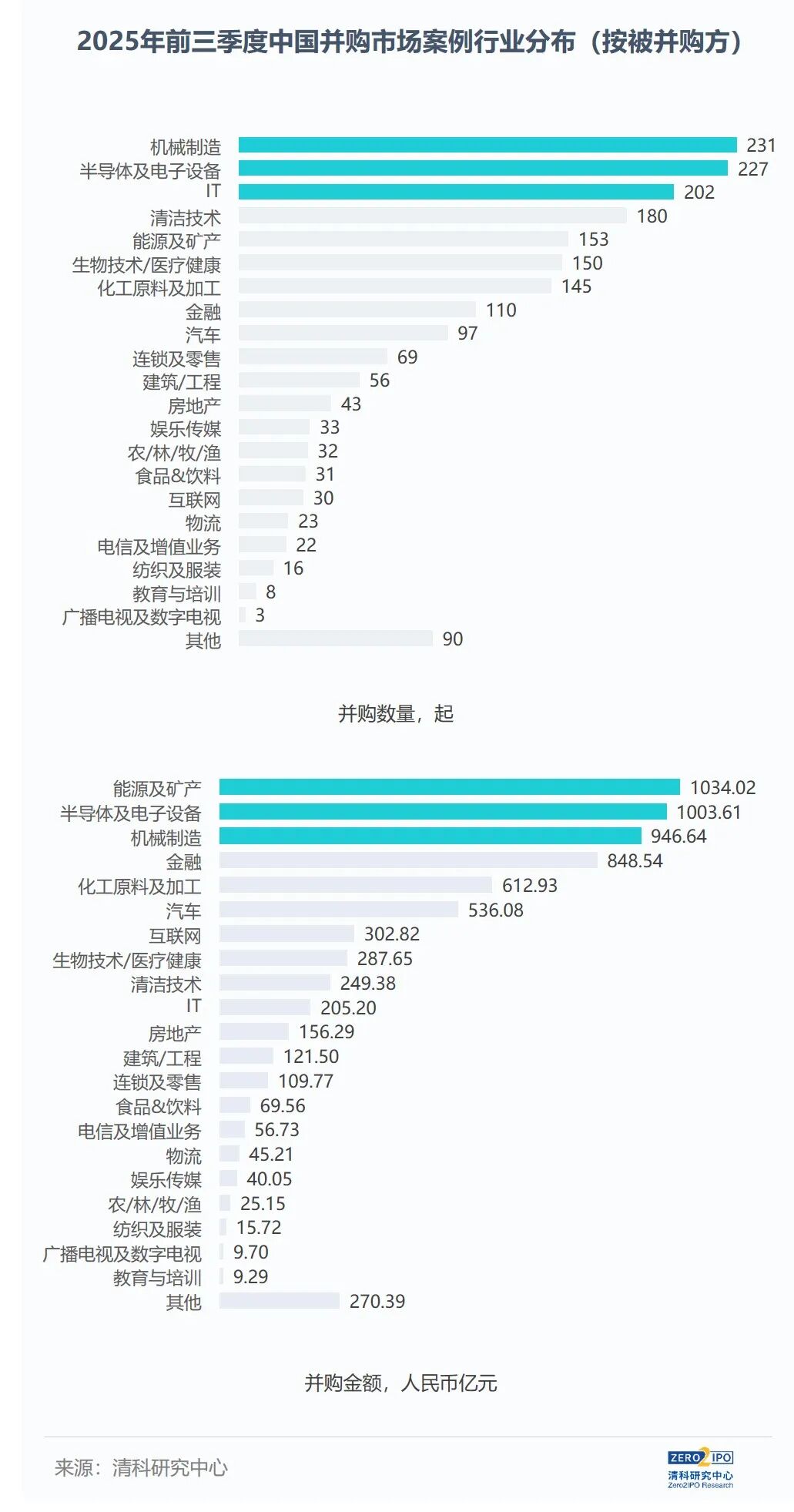 机械制造、半导体领域并购活跃,能源及矿产、半导体领域并购金额领先
