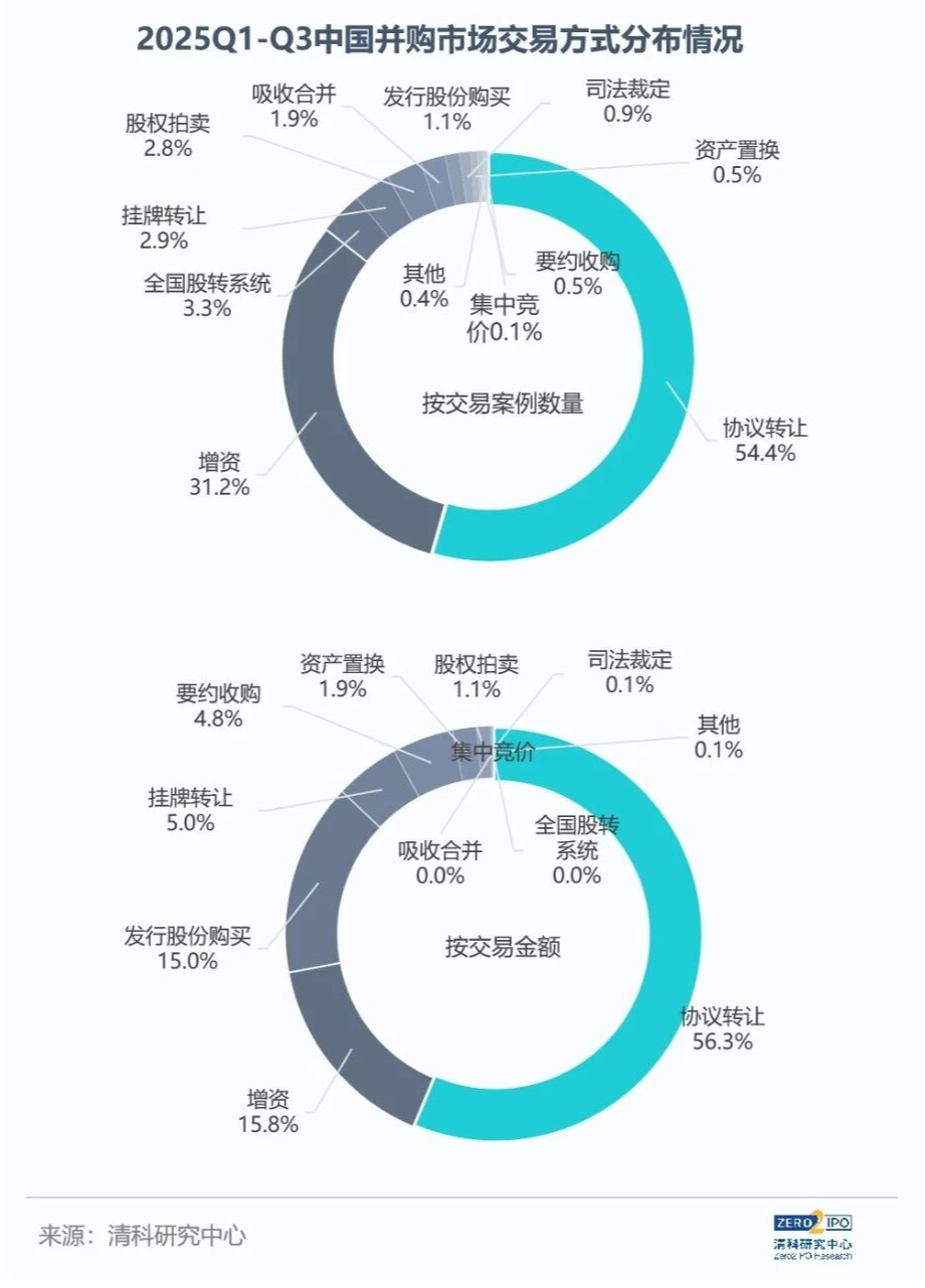 从交易方式来看,2025年前三季度中企参与并购案例主要通过协议转让、增资、全国股转系统转让三大方式进行,合计案例数量占比89.0%。其中上市公司发起的并购交易主要以协议转让、增资的方式交易,分别占上市公司发起并购案例数量61.5%、28.7%。非上市公司发起的并购案例则主要采用协议转让、增资、全国股转系统的交易方式完成,合计占非上市公司发起并购案例数量的87.9%。