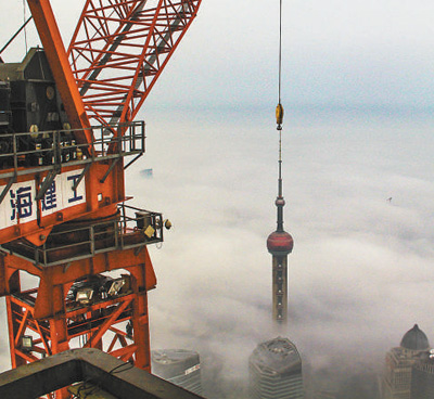 从高空吊车拍摄的晨曦中的东方明珠塔。