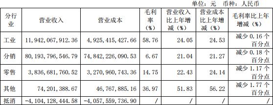 2019年上半年,上海医药分行业中,工业毛利率为58.76%,比上年减少0.16个百分点;分销毛利率为6.67%,比上年减少0.18个百分点;零售毛利率为14.75%,比上年减少1.17个百分点;其他毛利率为36.97%,比上年减少1.77个百分点。