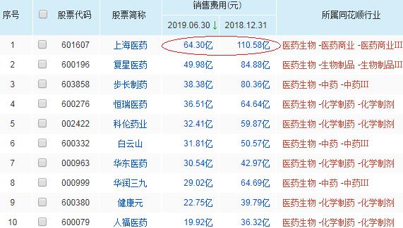 据同花顺数据统计显示,2018年及2019年上半年,在生物医药行业公司中,上海医药的销售费用均为最高。