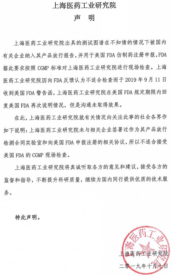 此前,FDA药品评价和研究中心(CDER)向上海医药工业研究院分析测试中心发出的警告信称,FDA原计划于2018年11月29日-12月4日对位于上海浦东区哥白尼路285号的上海医工院进行例行的检查和药品批准前现场检查。上海医工院于2018年12月4日就该项事先公布的检查计划向FDA中国办公室以书面回复的形式拒绝了检查。
