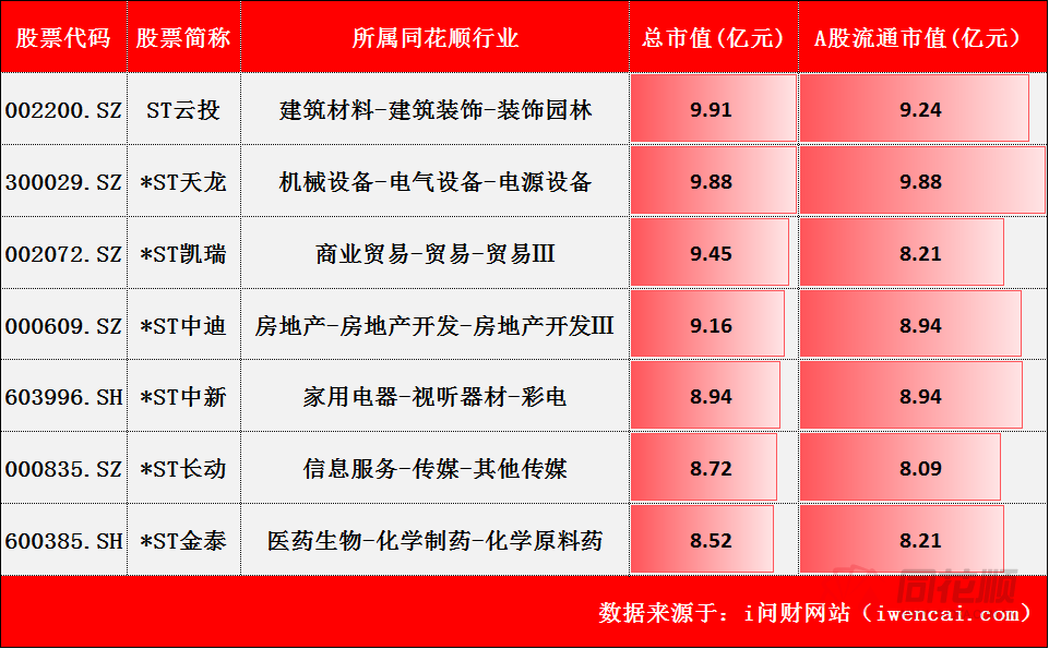 不过,从目前公司(剔除已在退市整理期或交易所决定退市的股票)市值排名来看,距离“3亿元”这一退市新红线最近的公司市值也超过8亿元。