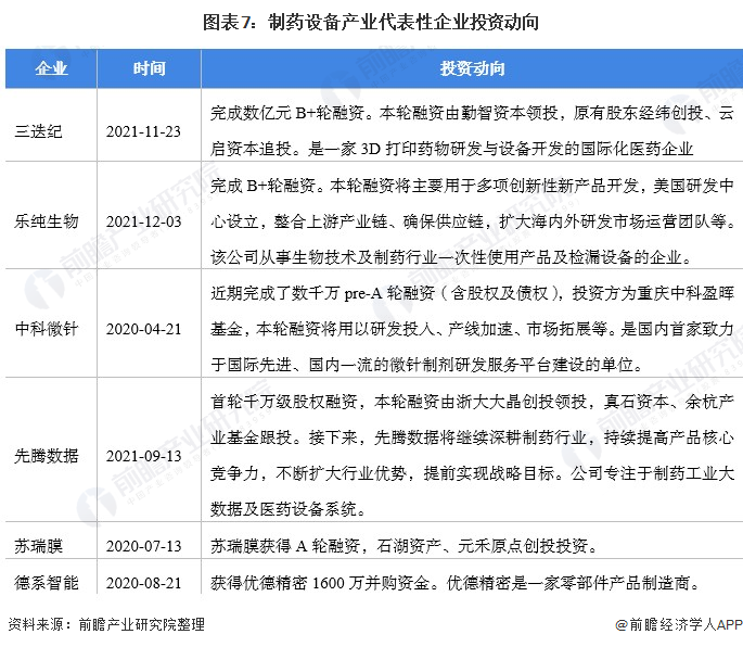制药设备产业代表性企业最新投资动向