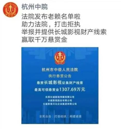 2019年12月,杭州中院发布悬赏令,以1307.69万元高价悬赏长城影视,征集财产线索,并对实控人赵锐勇、赵非凡父子进行悬赏。