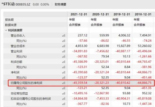 2021年,*ST长动实现营业收入仅237.12万元,净亏损高达4.54亿元。净资产也是连年为负,资不抵债,截至2021年底,归母公司股东权益更是-10.35亿元。