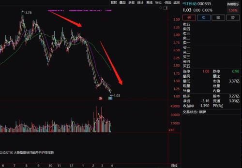 股价也是一路千丈,*ST长动最新收盘价为1.03元,市值仅剩3.37亿元。