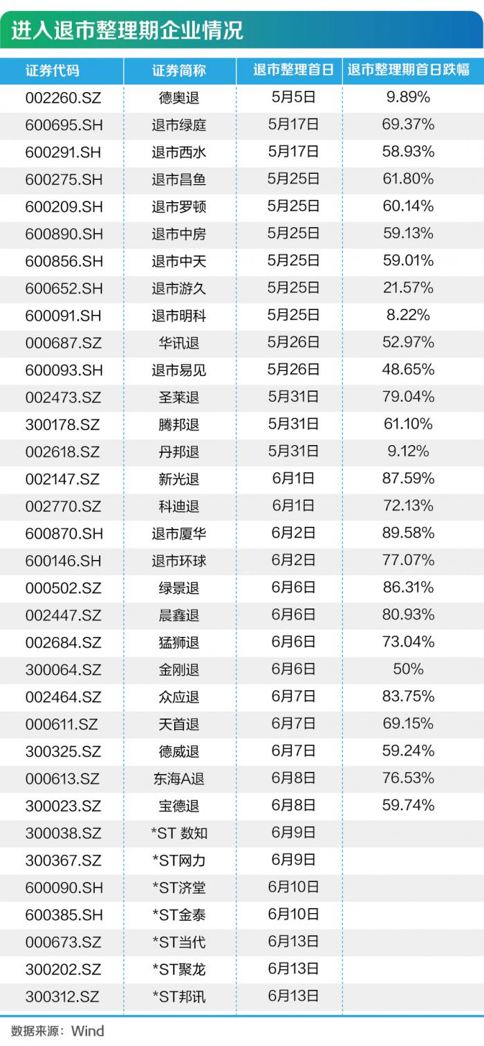 21世纪经济报道记者注意到,5月以来,已有34家企业被交易所做出终止上市决定,其中25家企业进入退市整理期交易,无一例外均遭遇股价大跌;7家尚在停牌,即将进入退市整理期;2家结束退市整理期,即将摘牌。