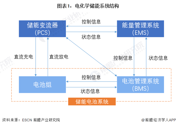 完整的电化学储能系统主要由电池组、电池管理系统(BMS)、能量管理系统(EMS)、储能变流器(PCS)以及其他电气设备构成。其中,电池组是储能系统最主要的构成部分;电池管理系统(BMS)主要负责电池的监测、评估、保护以及均衡等;能量管理系统(EMS)负责数据采集、网络监控和能量调度等;储能变流器可以控制储能电池组的充电和放电过程,进行交直流的变换。