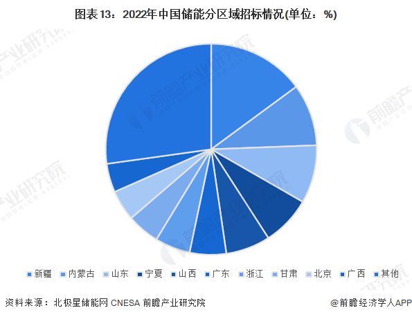 分区域看,新疆、内蒙古、山东、宁夏等地招标量占比较高。2022年,中国储能行业招标分布在新疆地区的事件数量占比14.9%,内蒙古占比9.5%,山东与宁夏各占比8.9%与7.6%。
