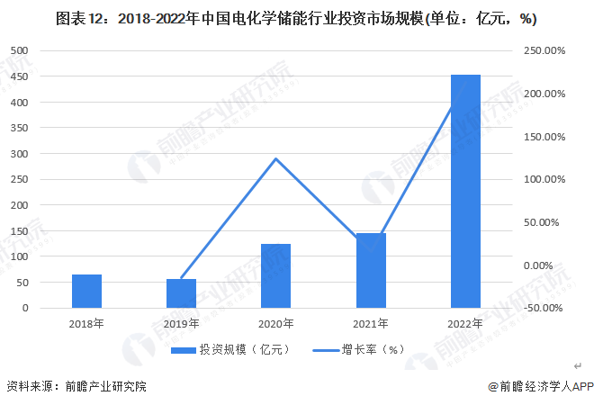 近年来,在电化学储能新增装机量快速增长的同时,电化学储能系统的成本在逐年下降。在放电时间为4小时的情况下,前瞻测算,2021年中国电化学储能系统的投资市场规模为144.6亿元。初步统计,2022年中国电化学储能系统的投资市场规模为453.1亿元,同比增长213.35%。