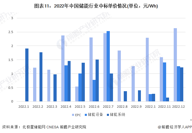 受电芯涨价、IGBT短缺等因素影响,2022年储能项目中标均价呈波动上升态势。EPC中标单价波动较大,12月均价2.64元/Wh,增长明显,储能设备价格均价为1.27元/Wh,储能系统12月价格上升明显,12月价格升至1.23元/Wh左右。
