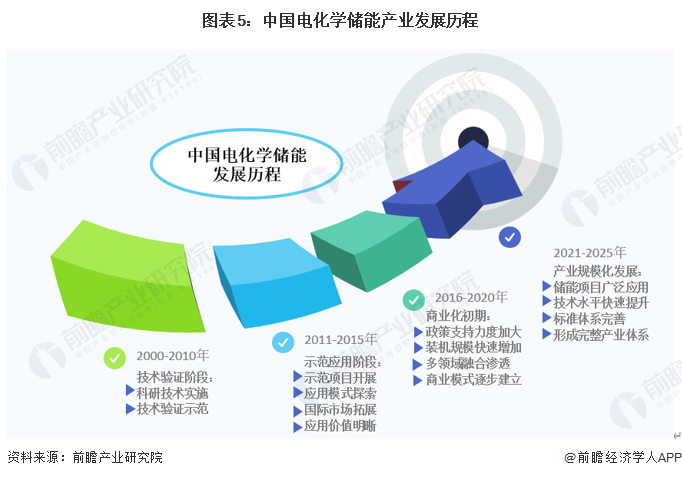 我国电化学储能市场大致可分为四个发展阶段:一是技术验证阶段(2000-2010年),主要是开展基础研发和技术验证示范;二是示范应用阶段(2011-2015年),通过示范项目开展,储能技术性能快速提升、应用模式不断清晰,应用价值被广泛认可;三是商业化初期(2016-2020年),随着政策支持力度加大、市场机制逐渐理顺、多领域融合渗透,储能装机规模快速增加、商业模式逐渐建立;四是产业规模化发展阶段(2021-2025年),储能项目广泛应用、技术水平快速提升、标准体系日趋完善,形成较为完整的产业体系和一批有国际竞争力的市场主体,储能成为能源领域经济新增长点。