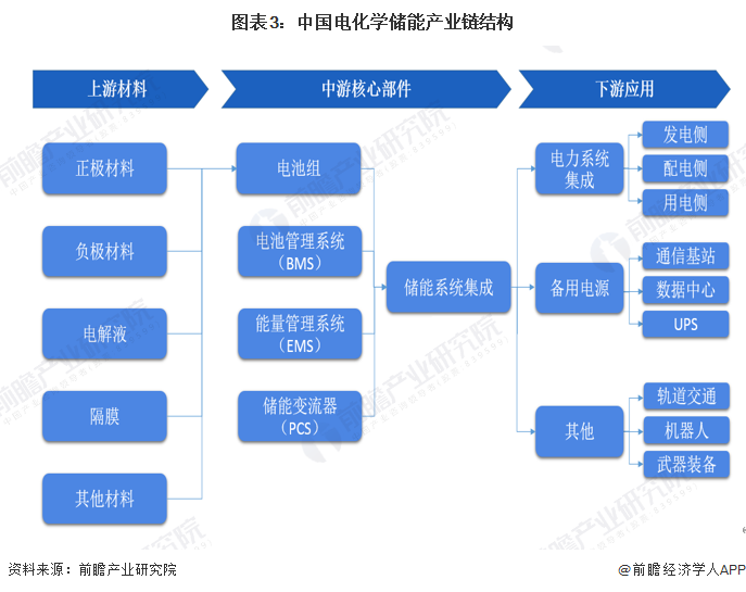 电化学储能产业链可分为上游材料、中游核心部件制造、下游应用。储能产业链上游主要为电池原材料,包括正极材料、负极材料、电解液、隔膜以及结构件等。产业链中游主要为储能系统的集成与制造,对于一个完整的储能系统,一般包括电池组、电池管理系统(BMS)、能量管理系统(EMS)以及储能变流器(PCS)四大组成部分。产业链下游主要为不同应用场景的运维服务等,如储能可用于电力系统的发电侧、输配电侧、用电侧,实现调峰调频、减少弃光弃风、缓解电网阻塞、峰谷价差套利、容量电费管理等功能:其他应用场景还包括通信基站、数据中心等的备用电源,以及为机器人系统供电,保障高性能武器装备的稳定运行等。