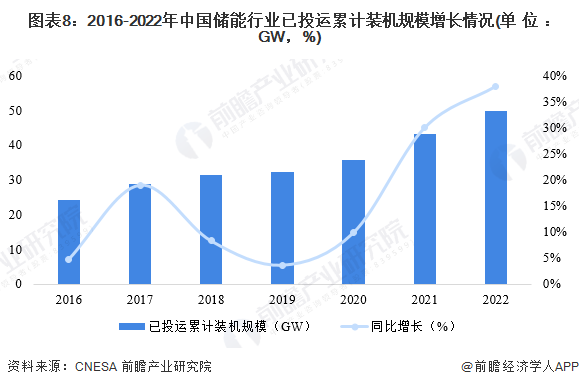 在中国新能源发电规模大幅增长的推动下,中国储能装机规模一直保持高速增长的趋势。根据CNESA历年《储能产业研究白皮书》中统计数据,截至2022年底,中国已投运储能项目累计装机规模为59.8GW,同比增长38%。