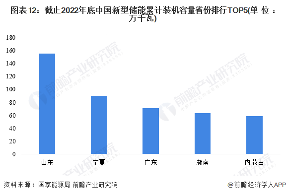 就新型储能区域分布来看,截止2022年底,中国新型储能累计装机规模前五名省份分别为山东、宁夏、广东、湖南、内蒙古。累计装机规模分别为:山东155万千瓦、宁夏90万千瓦、广东71万千瓦、湖南63万千瓦、内蒙古59万千瓦。