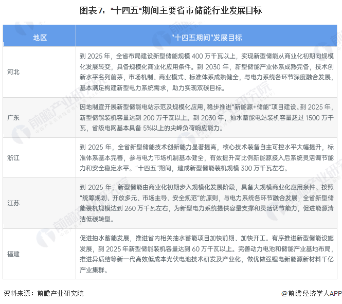 “十四五”期间,我国主要省份也提出了储能行业的发展目标。其中,河北提出,到2025年,全省布局建设新型储能规模400万千瓦以上,实现新型储能从商业化初期向规模化发展转变,到2030年,新型储能产业体系成熟完备,技术创新水平名列前茅。其他地区发展目标如下所示: