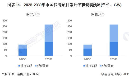 虽然未来压缩空气储能、熔融盐储能等储能技术也将迎来火热发展,但综合来看,抽水蓄能与电化学储能依旧占据储能市场主导。前瞻预计,到2030年,中国储能整体装机规模有望达到267GW(保守场景)、376GW(理想场景)。