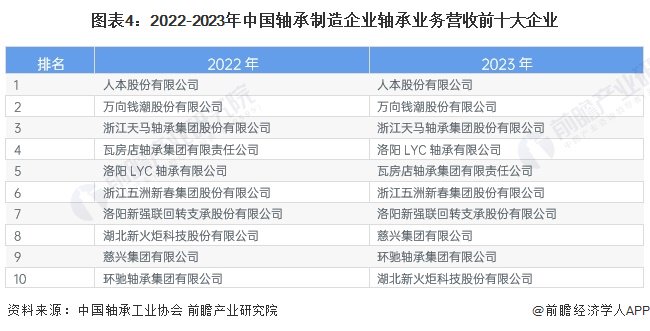 根据轴承行业协会披露的信息,2022年、2023年,中国轴承制造企业轴承业务营收前十大企业排名变化较小,人本股份有限公司、万向钱潮股份有限公司和浙江天马轴承集团股份有限公司始终位列前三。